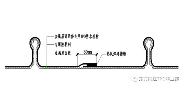 卷材通过TPO专用胶粘剂紧密粘接在钢板面层上,搭接缝处进行热空气焊接,接缝牢固可靠,形成无缝整体,TPO卷材具有较大的断裂延伸率,可更好的适应金属屋面变形。