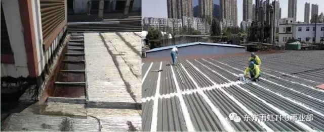 针对前述沥青卷材及涂料类应用在压型金属屋面维修工程中的弊端,东方雨虹研发了金属屋面修缮专用TPO防水卷材,从根本上解决了压型金属屋面的渗漏问题,东方雨虹维修专用TPO采用更加柔软的TPO配方体系,使之能够有效的顺着压型钢板的波形进行粘接贴合。