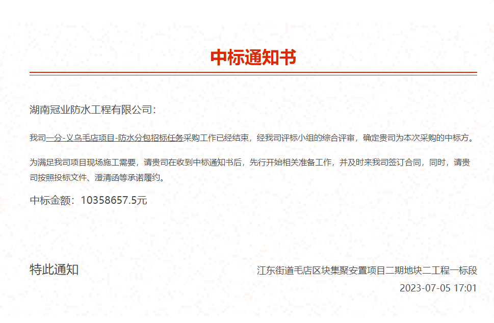 2023年7月5日湖南冠业防水工程有限公司中标浙建集团“江东街道毛店区块集聚安置项目二期地块二工程一标段”项目,合同金额约为1035万元。